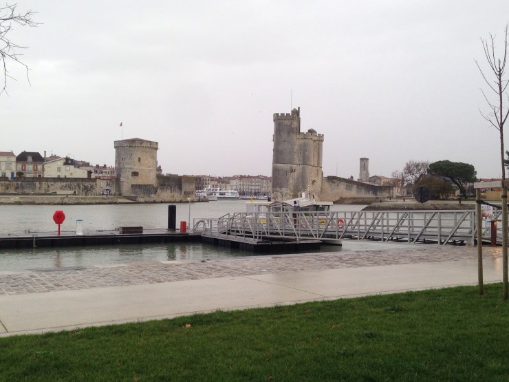 Driving through flat and marshy Charente-Maritime, with flooded canals on either side of the road, watching the temperature gauge steadily rise from 5 to 14, we arrived in the pretty and bustling coastal town of La Rochelle, all lit up for Christmas.