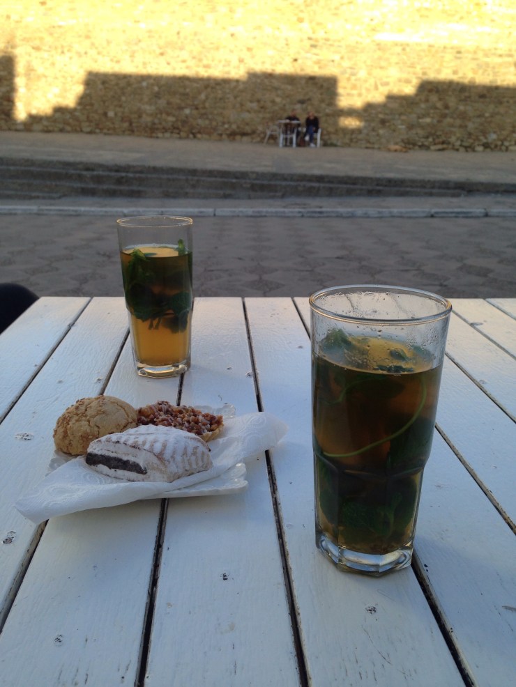 We changed up some Dollars to Dirhams and headed into the old town through an impressive arch and had mint tea and pastries in a square facing the main gateway tower into the old walled town.