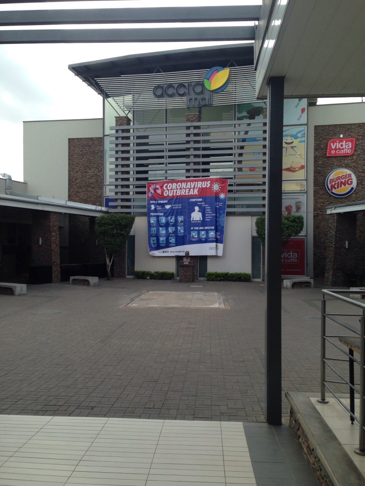 Accra Mall was still open when we went to buy suitcases for the flight home. We went early in the morning, but it felt uncomfortable being on the streets with many people wearing masks and plastic gloves. Information banners were displayed in various places around the Mall.